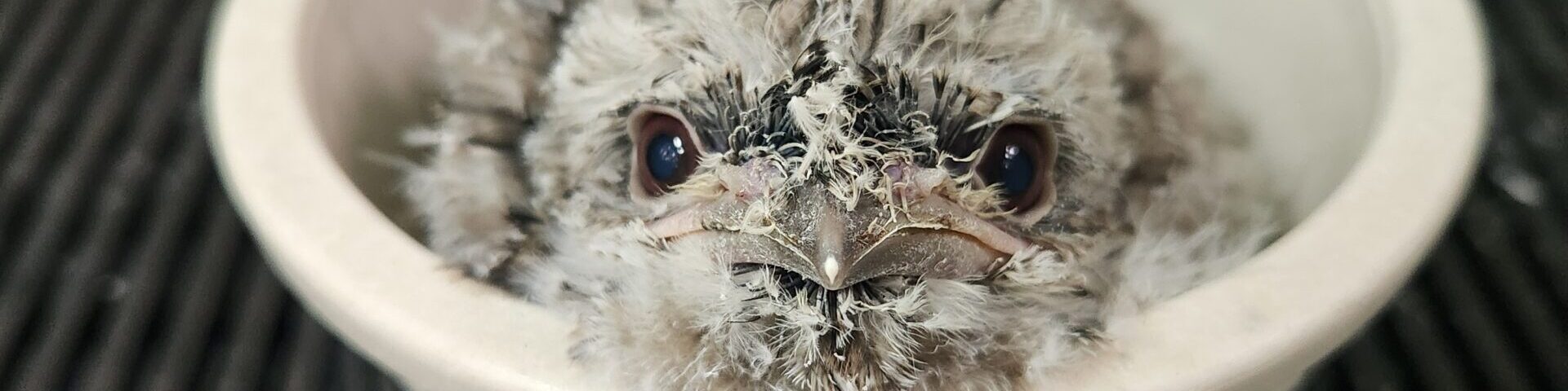 Tawny frogmouths are named so due to their tawny coloration and their large frog-like mouths (creative, we know). These birds are nocturnal, primarily active at night, and use that big mouth to hunt down food such as insects, small rodents, lizards, and even small birds. Here at Zoo Atlanta, we have two breeding pairs of tawny frogmouths: Mama and Barkley, and Small Fry and Jabba. This past breeding season both pairs were very successful, and we ended the season with four tawny frogmouth chicks!